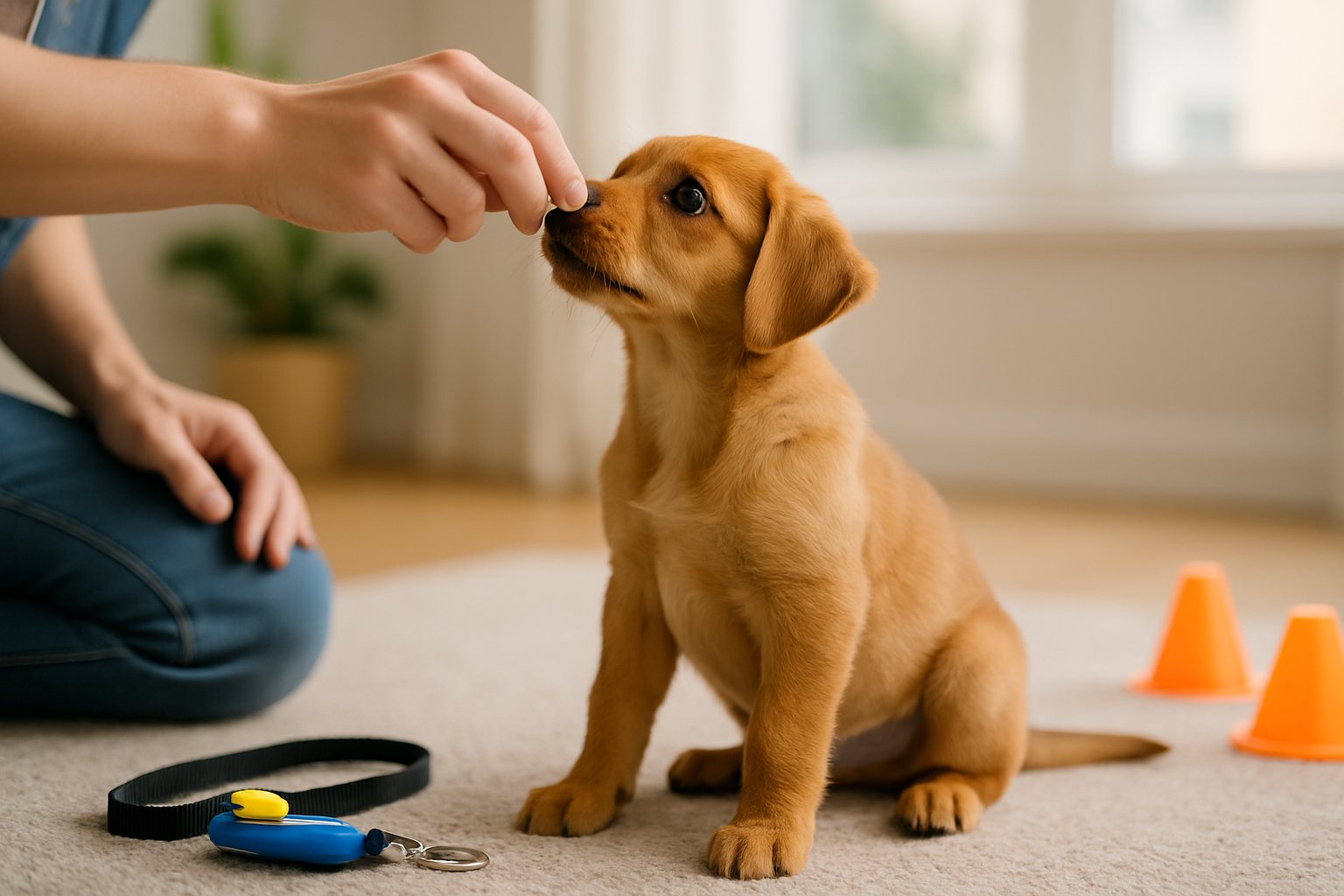 Koiranpentu istuu keskittyneenä matolla ja seuraa kouluttajan kättä, joka pitää herkkupalaa kädessään.